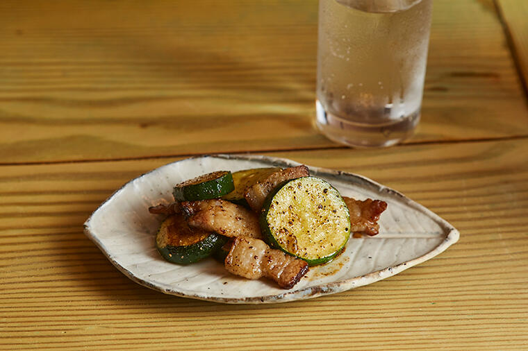 ズッキーニはベーコンの脂を纏わせるように炒めるのがポイント。黒胡椒もアクセントに、透明感ある野菜が際...