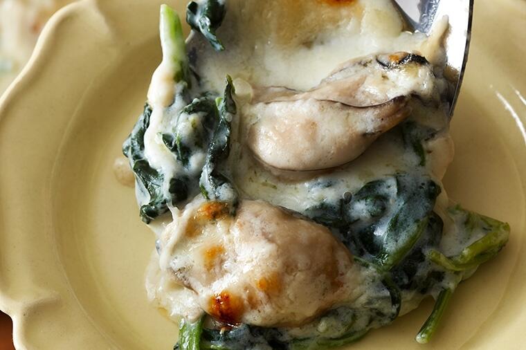 ホワイトソースをまとった海のミルクは極上の旨さ。濃厚な味の冬のほうれん草との絶品冬コラボです。定番の...