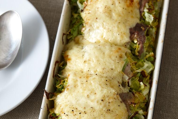 大庭さんお薦めのアイディアグラタンです。春キャベツはやわらかくて甘味もひときわ。ソースはチーズを活用...
