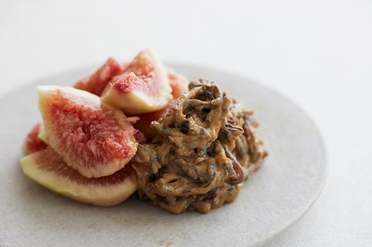 甘麹と胡麻ペーストできくらげを和えたものがソース代わり。いちじくの上品な風味と合わさると垢抜けた味わ...