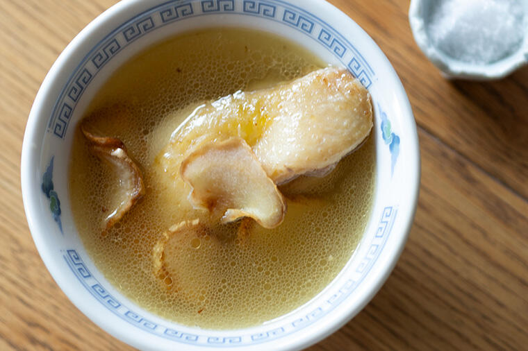 このスープの特徴は、たっぷりの生姜と酒で骨付き鶏を煮込むこと。鶏肉の旨味、酒のまろやかさ、生姜の甘い...