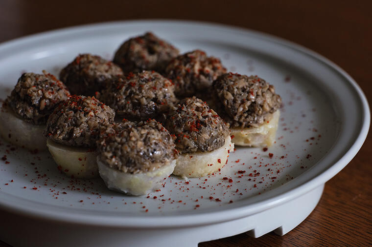 きのこペーストをたっぷりとのせた里芋は、芋のねっとりとした甘味とあいまって、箸が止まらなくなる味わい...