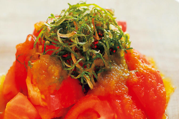 冷やしトマトにかけた玉ねぎだれが、日本酒と相性抜群。大葉やみょうがの香りがすっと立ち昇る、爽快な味わ...