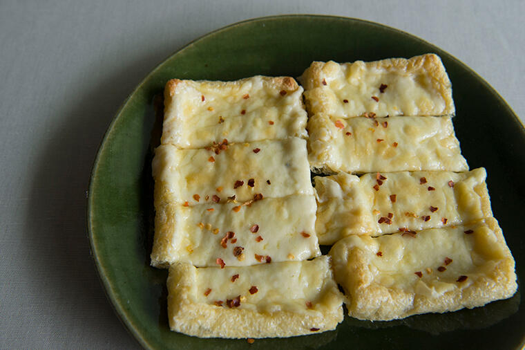 オーブントースターで焼き上げた油揚げとチーズが、ところどころ香ばしく色づいて旨い!粗挽きの赤唐辛子を...