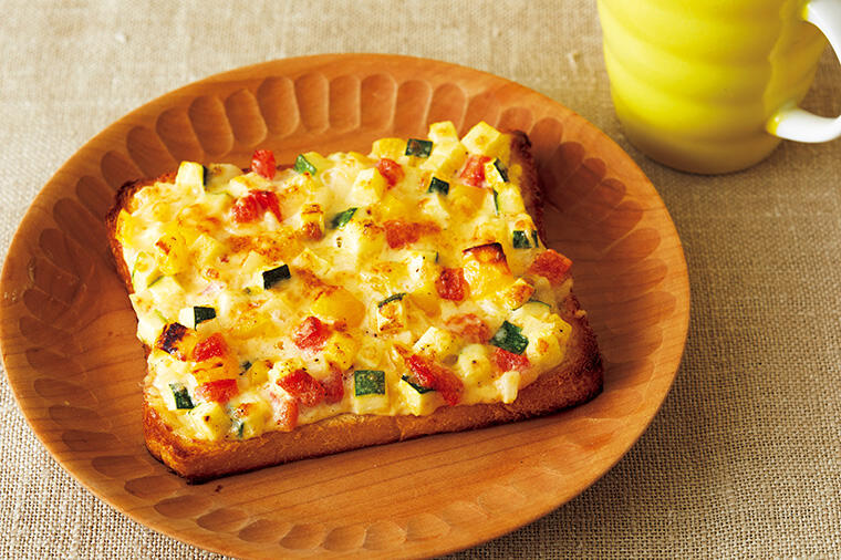 マヨネーズでからめた野菜をたくさんのせて焼くだけのシンプルなトーストです。まろやかな風味と野菜の甘味...