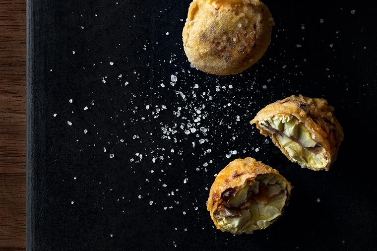栗をじっくりと揚げて、外はさくっと中はほっこり甘い、秋の味覚を堪能できる天ぷらに仕上げました。器と料...