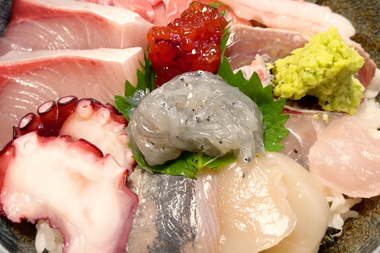 「まるしげ」の人気メニュー、くじらの刺身用の赤身肉を使ったポキ丼です。旨味の濃いくじら肉と、アボカド...
