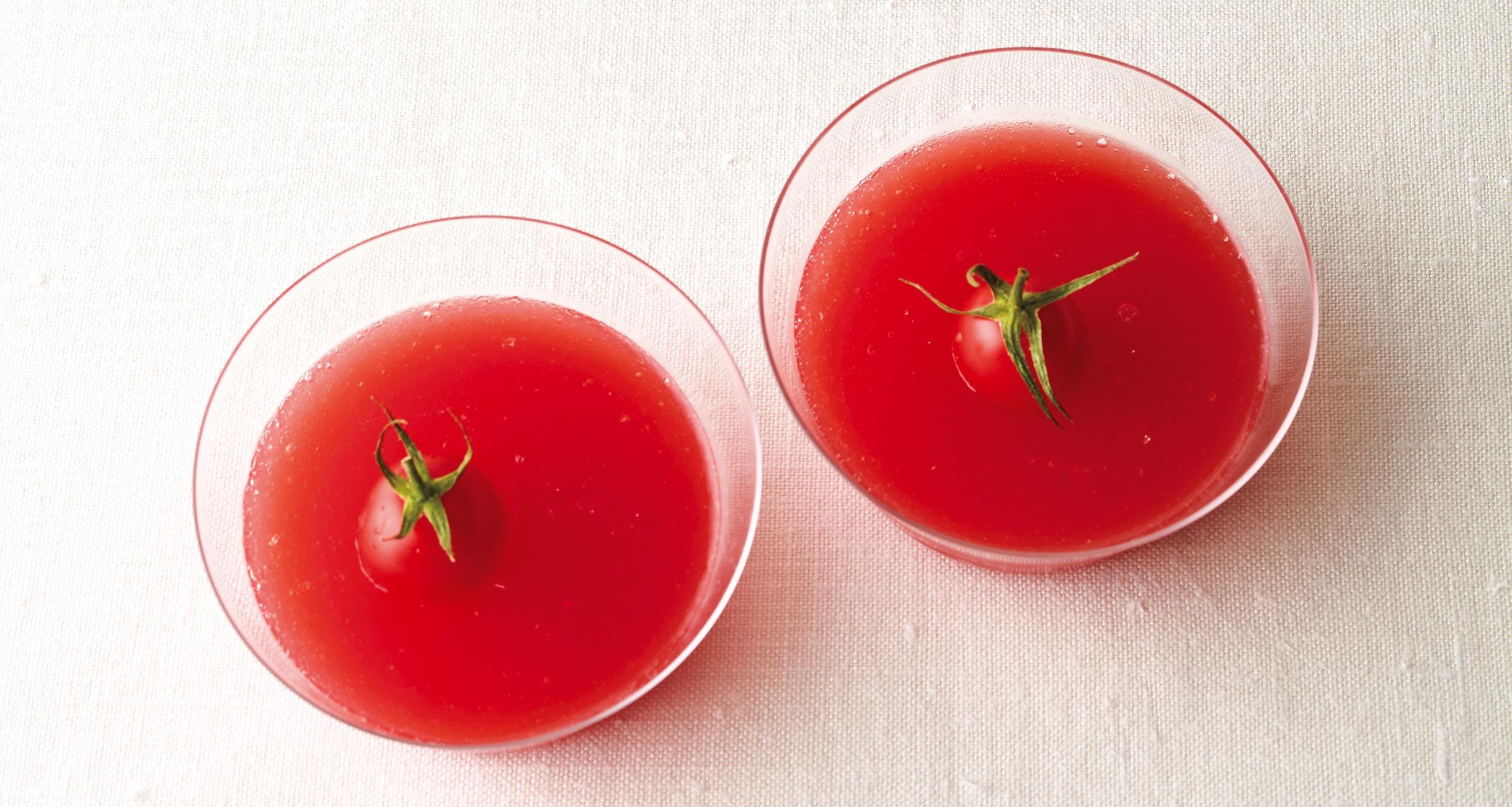真っ赤に輝く華やかなデザートです。トマトのおいしさを丸ごとそのまま味わえます。料理研究家の大庭英子さ...
