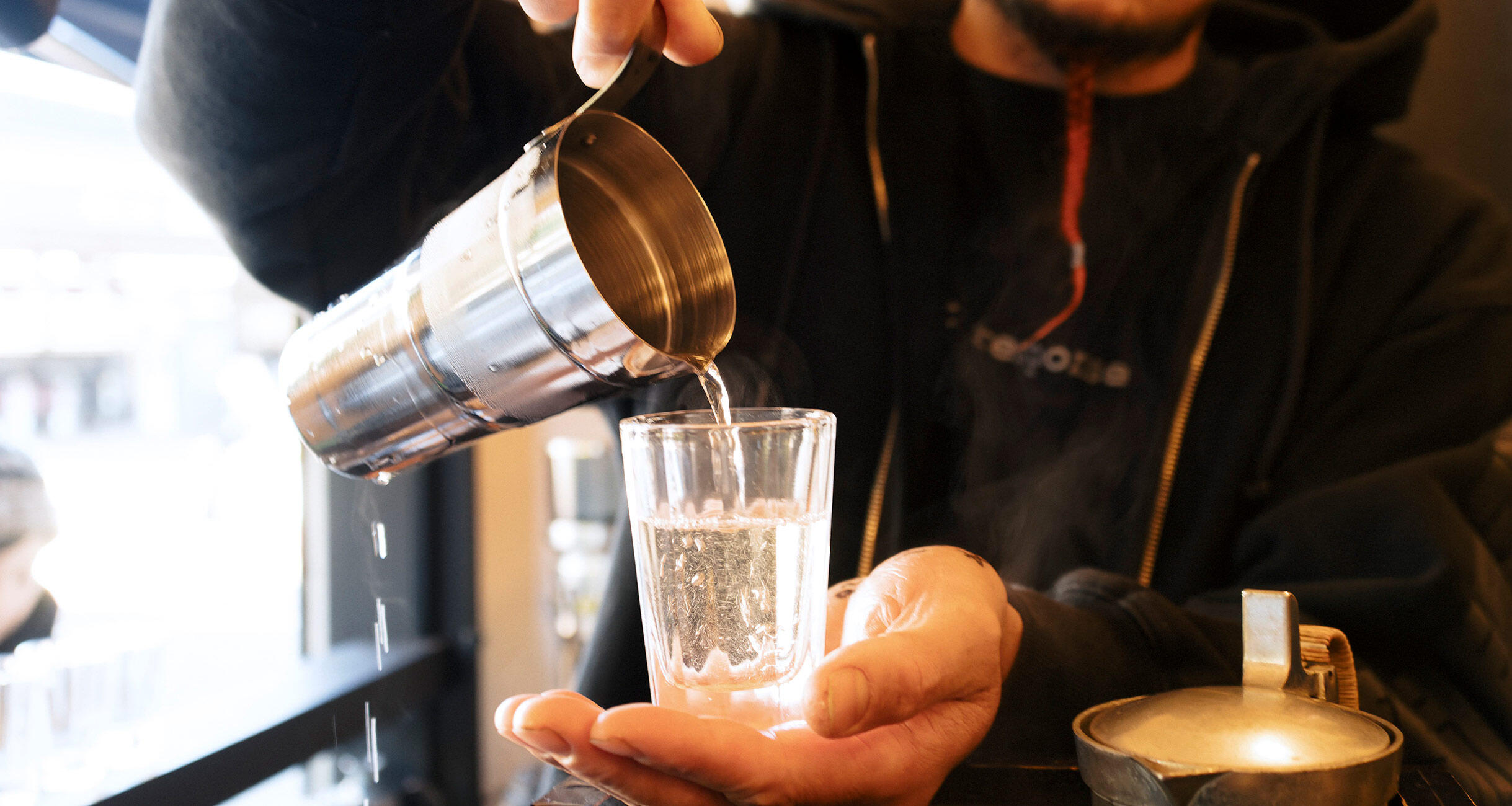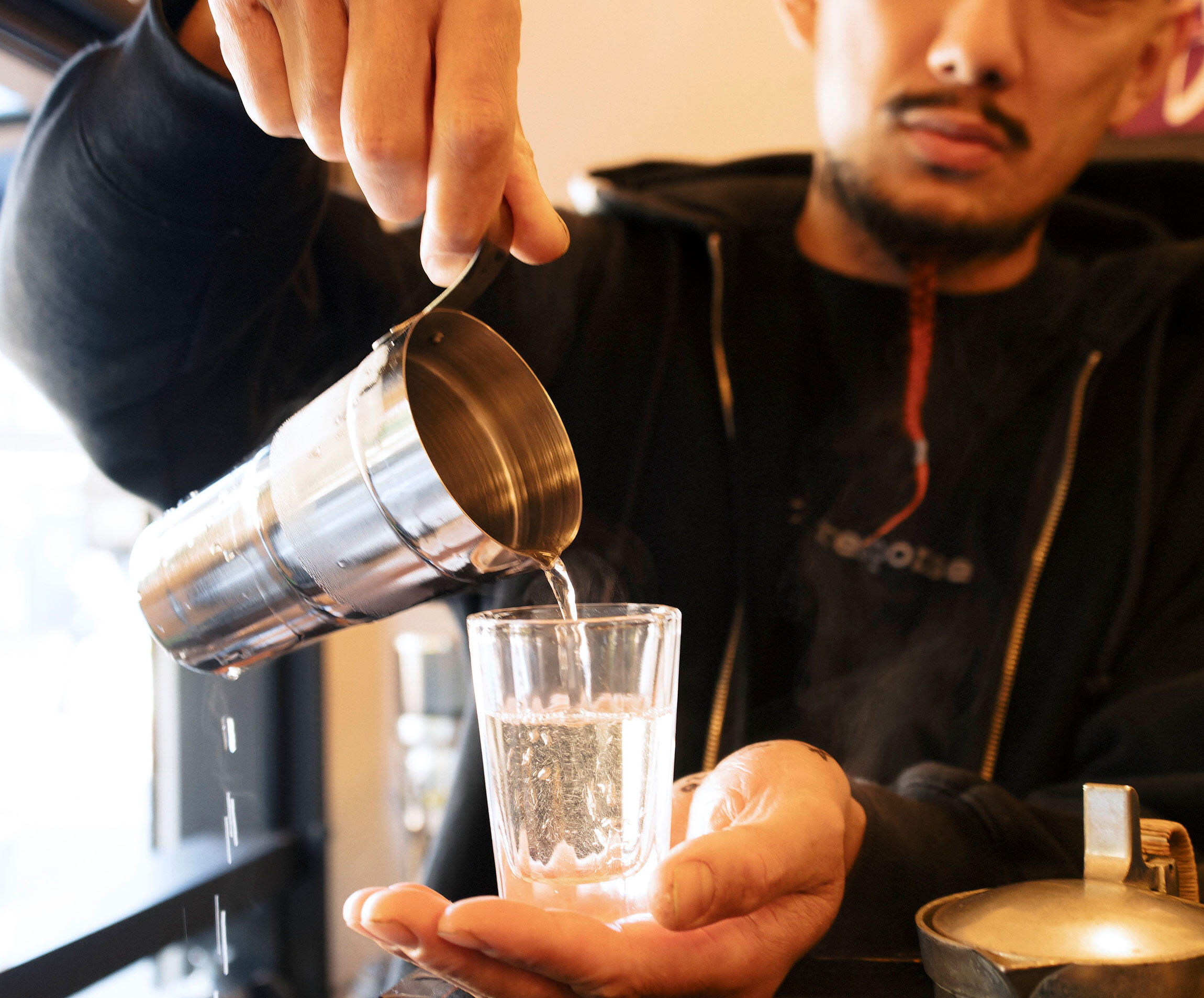 “割り水燗”とは、日本酒を水で割ってなじませてから燗つけして飲む、燗酒の新しい楽しみ方。適度な濃さで飲み疲れしにくく、盃を重ねながらほろ酔い加減が持続する割り水燗は、音楽を聴きながらゆるゆると飲むのに最適なのです。